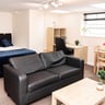 Studio 3 has king size bed, 2 metres of wardrobe, desk, executive style chair and bookcase. The kitchen is fully fitted to include hob, full size oven, microwave convection oven, fridge with freezer compartment. Leather sofa, coffee table and dining table and chairs are also provided.