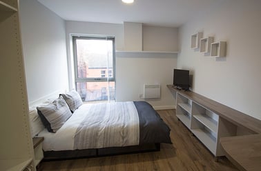 Megaclose are proud to announce our latest student development, ideally located in the heart of Nottingham city centre. Clare Court is situated next door to the Victoria shopping centre and a short walk from the Nottingham Trent University city campus. Students attending the University of Nottingham benefit from a direct bus route to the university campus with the bus stop located within yards of Clare Court, while Confetti (NTU) is located opposite. Each self-contained studio has been superbly designed and has a modern kitchen with four ring hob, full size oven, 50/50 fridge/freezer and separate microwave. The studio also has a double bed, individual en-suite facilities, flat screen TV and generous study and storage space. On every floor there are free laundry facilities. This studio is 21.7Sqm.
