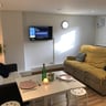 Secure and well lit private entrance, alarmed, bright hallway, very large lounge with comfy sofas and flat screen tv, separate newly refurbished kitchen with fitted units and washing machine.