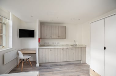 These stylish studios are equipped with high-quality space-saving furniture and boast a modern kitchen fitted with essential appliances, including a fridge/freezer, main oven, and microwave oven.