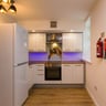 This open-plan studio apartment is thoughtfully designed and beautifully furnished, offering ample storage throughout. The apartment features a fully fitted kitchen equipped with a 4-zone hob, oven, large fridge/freezer, washer/dryer and breakfast bar, providing a practical and comfortable space for everyday living.