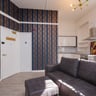 Apartment Kitchen/Lounge/Diner: Large area for socialising, eating, and lounging with a generous TV. An impressive fully fitted kitchen. Fully integrated, modern units comprising of fridge/freezer, electric hob, electric oven, worktop space, extractor fan and lots of space.