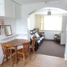Kitchen with large fridge, 2nd fridge, freezer, microwave, gas hob and oven, washing machine, dining table and chairs