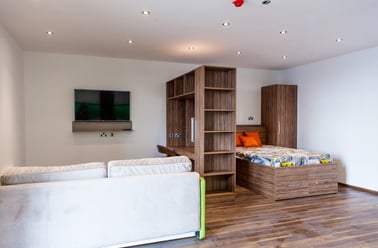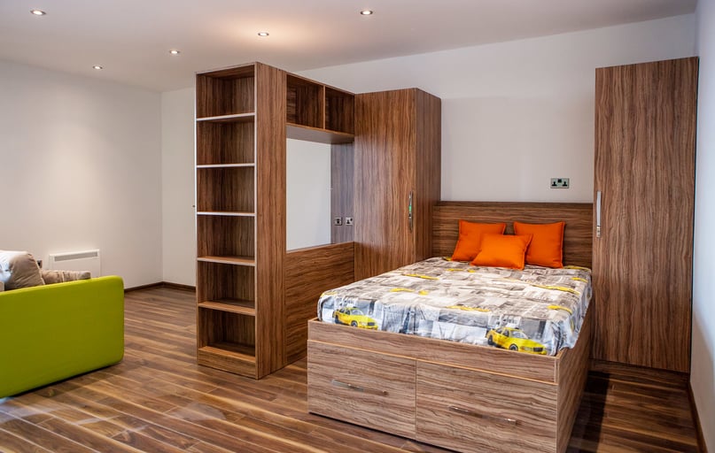 BEDROOM AREA: All beautifully furnished with fitted bed, wardrobe, under bed storage and shelving units, smart TV, Ethernet connection, desk, chair.