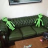 A lounge has a green leather chesterfield sofa, 2 matching armchairs, 2 Giant beanbags, a tucked away small dining table with nest of stacking chairs for occasional use.