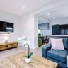 The bright open-plan living area features comfy sofas, a smart flat-screen TV with sound bar, and a dining table that's ideal for shared meals or study sessions. The kitchen is equipped with modern appliances including a dishwasher, washer, fridge-freezer, providing everything you need for convenient, stress-free living.