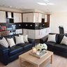 The living area is furnished with two sofas, coffee table, dining table with chairs and TV stand. There are large front facing double glazed windows and two central heating radiators.