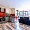 The modern kitchen/living area has all integrated appliances. The large kitchen area has full granite worktops and splash backs with has amtico flooring throughout the property. The 50/50 fridge/freezer and washer/dryer and dishwasher are all integrated. The electric built-in-oven and electric hob. The living area has large floor to ceiling windows giving great views of the city. It comes with 2 faux leather 2-seater settees, a coffee table and TV stand. We can also supply you a TV for an additional cost.