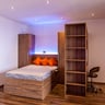 Bedroom Area: Beautifully furnished with a fitted bed, wardrobe, under-bed storage, shelving units, desk, chair, smart TV, and ethernet connection.