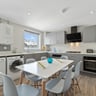 There is an open-plan kitchen/lounge/diner with a dining table, 2 leather sofas, and a fully furnished kitchen with all of its amenities including a dishwasher and 2 full-height fridges. There is also a washer/dryer and a flat-screen TV.