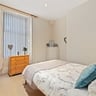 The bedroom is fully furnished with a double bed, chest of drawers, bedside table, 2 wardrobes, and a desk. The light floods through the large windows making the flat feel bright and airy.
