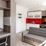 A modern, fully integrated kitchen including a fridge/freezer, electric hob, electric oven, extractor fan, and ample worktop space.