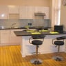 The flat has an open plan lounge/kitchen with wooden floors, ample high gloss white cupboards, two fridge/freezers, oven, hob, microwave convection and dishwasher. There is a breakfast bar with seating for six, leather sofas, coffee table, comfy chairs, and a large flat screen freeview TV.