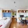 Bedroom: Fully furnished with fitted furniture consisting of a double bed, wardrobe, under bed storage and shelving units, smart TV, Ethernet connection, desk, and chair.