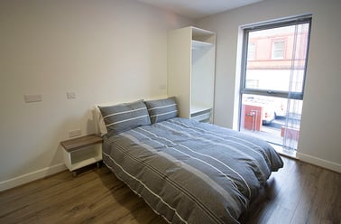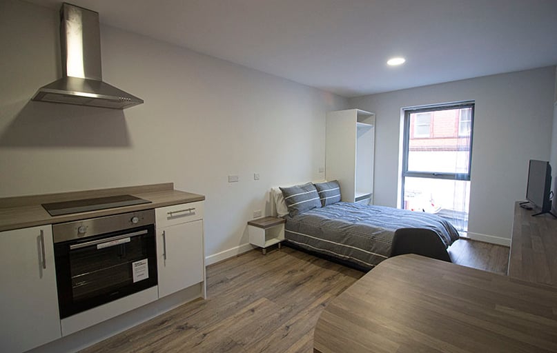 Each self-contained studio has been superbly designed and has a modern kitchen with four ring hob, full size oven, 50/50 fridge/freezer and separate microwave. The studio also has a double bed, individual en-suite facilities, flat screen TV and generous study and storage space. On every floor there are free laundry facilities.