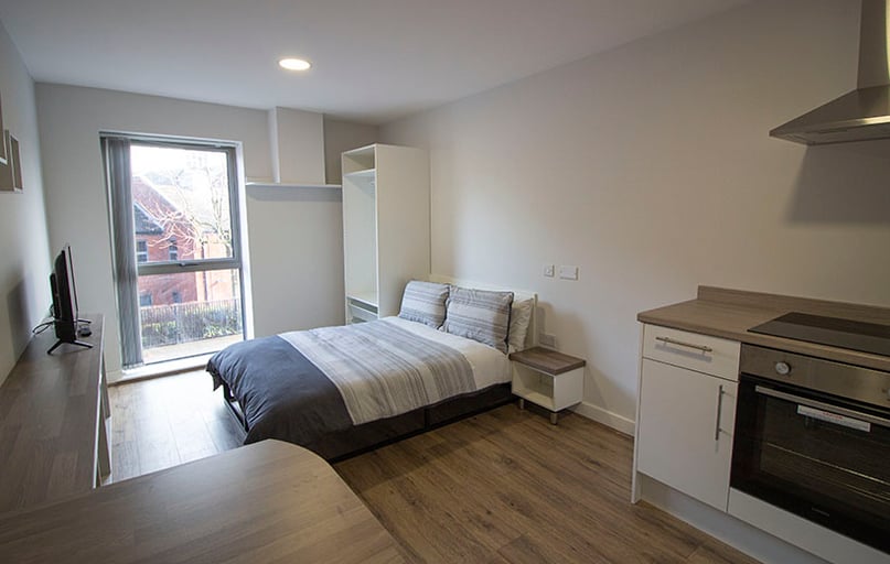 This self contained studio has been superbly designed and has a contemporary kitchen with four hobs (induction), oven, 50/50 fridge-freezer and microwave. The studio also has double bed, individual en-suite facilities, flat screen TV and a generous study and storage space. While on every floor there are free laundry facilities.