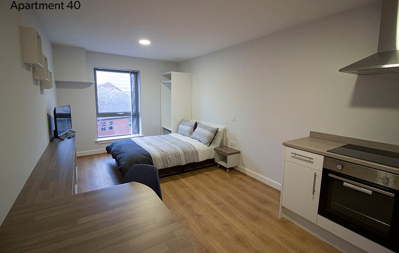 Each self contained studio has been superbly designed and have contemporary kitchen with four hobs (induction), oven, 50/50 fridge-freezer and microwave. The studio also has a double bed, individual en-suite facilities, flat screen TV and a generous study and storage space. While on every floor there are free laundry facilities.