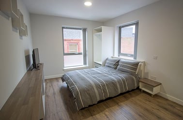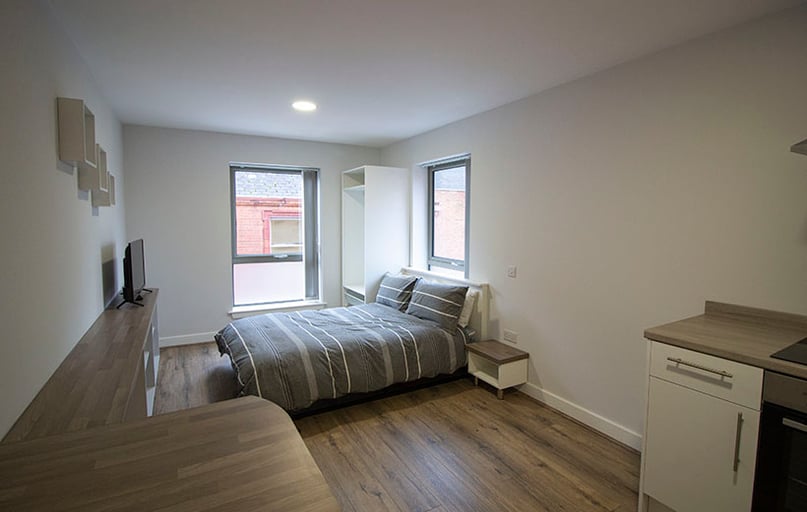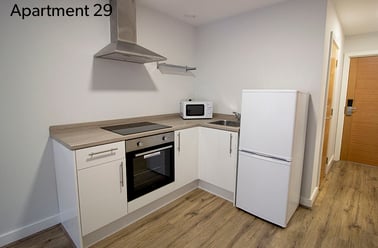 Each self-contained studio has been superbly designed and has a modern kitchen with four ring hob, full size oven, 50/50 fridge/freezer and separate microwave. The studio also has a double bed, individual en-suite facilities, flat screen TV and generous study and storage space. On every floor there are free laundry facilities.
