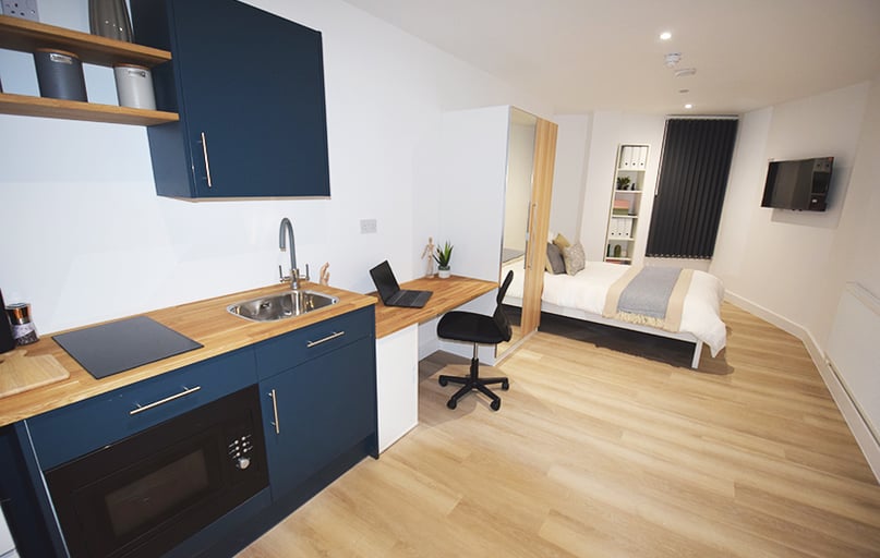 This brand new development is situated in a great location opposite the Victoria Centre and less than a 2 minute walk from the Nottingham Trent University city campus. A Stylish self-contained studio apartment, features a double bed, generous study and storage space along with its own kitchen and spacious en-suite with ample sized shower.