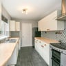 Window to the side elevation, tiled floor and half tiled walls. Matching wall and base units with a freestanding cooker, washing machine and fridge freezer.