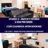 Studio 3 has king size bed, 2 metres of wardrobe, desk, executive style chair and bookcase. The kitchen is fully fitted to include hob, full size oven, microwave convection oven, fridge with freezer compartment. Leather sofa, coffee table and dining table and chairs are also provided.
