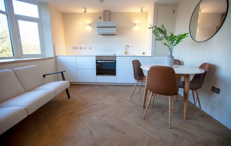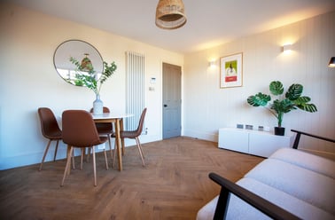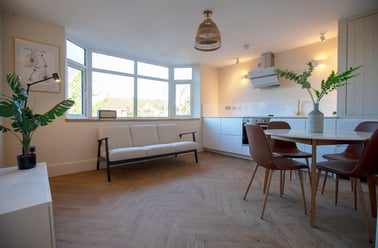 The spacious double bedroom and living area boast elegant wooden paneling, while large bay windows flood the space with natural light. French oak flooring runs throughout, complementing the contemporary décor. The bathroom is a standout feature with its unique terracotta flooring, adding a distinctive touch.