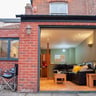 LIVING AREA – forming part of the open plan kitchen/dining area. large leather corner sofa, tv cabinet, tv&bt points, Double glazed window to side, folding doors to private patio garden.