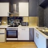 Kitchen / Lounge / Dining Area: A spacious open-plan area ideal for socialising, dining, and relaxing, complete with a generous TV. The impressive fully fitted kitchen features modern, integrated units comprising two large fridge freezers, 4-zone electric hob, electric oven, extractor fan, generous worktop space, and ample storage.