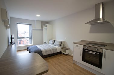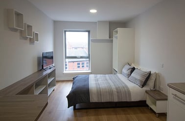 Clare Court is situated next door to the Victoria shopping Centre and a short walk from the Nottingham Trent University city campus. Students attending the University of Nottingham benefit from a direct bus route to the university campus with the bus stop located within yards of Clare Court, while Confetti (NTU) is located opposite. Each self-contained studio has been superbly designed and has a modern kitchen with four ring hob, full size oven, 50/50 fridge/freezer and separate microwave. The studio also has a double bed, individual en-suite facilities, flat screen TV and generous study and storage space. On every floor there are free laundry facilities. No booking fee, no damage deposit. SPECIAL OFFER: SIGN UP TO CLAIM 9 MONTHS FREE MEMBERSHIP AT THE GYM GROUP (CITY CENTRE) OR A £150 VOUCHER (T&Cs APPLY). Please note, the photos depict the showroom and should be used for indicative purposes only. Only £185pw