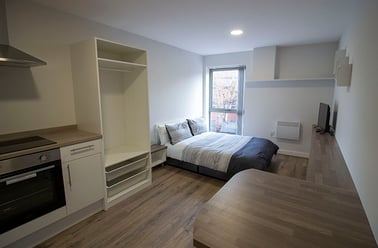 Each self-contained studio has been superbly designed and features a contemporary kitchen with two hobs, combi-microwave oven and a 50/50 fridge/freezer. The studio also includes a double bed, individual en-suite facilities, a flat-screen TV, and generous study and storage space. Free on-site facilities and lift access are available for all residents.