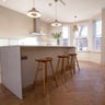 The sleek modern kitchen features quartz countertops, a large island, and a built-in dining window seat in the bay window, perfect for socialising or studying. There are two bathrooms, combining modern tiling with traditional wooden panelling and British larch cladding for a stylish finish.