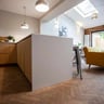 The ground floor open-plan living space features a bespoke ply kitchen with quartz countertops and peninsula island, a dining area, and a living room with aluminium patio doors opening onto a mature garden with Indian stone patio.