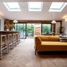 The home features a stylish open-plan living space with a bespoke ply kitchen, large island, and quartz countertops. The living room boasts a stunning mural, while a handmade Crittall-style mirror serves as a striking backdrop to the dining area. Solid French oak parquet flooring runs throughout, adding elegance and warmth.