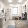 The studio comes fully furnished with a comfortable double bed, generous storage, a dedicated study area, and a sleek kitchenette with integrated appliances. The en-suite bathroom is finished to a high standard, and the layout has been carefully planned to maximise both space and comfort.