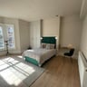 The room features a luxury double bed with an upholstered headboard, complemented by hotel-style pendant lighting and recessed spotlights, creating a calm, premium feel. Thoughtfully designed built-in wardrobes and storage keep the space sleek and clutter-free. Perfect for working or studying, the room includes a dedicated desk and chair, making it ideal for professionals or students alike.