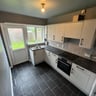 - Kitchen area with a range of wall and base storage units, gas hob and oven, fridge freezer, washing machine.