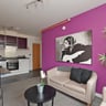 Each apartment features a bright, spacious, open-plan kitchen and living area with a feature wall, large windows and modern furnishings. The kitchen is fully equipped with a washer-dryer, dishwasher, fridge, freezer, microwave, oven and hob, along with a dining set, making everyday living easy and convenient. The comfortable lounge area includes two double sofas, a coffee table and a wall-mounted flatscreen TV, perfect for relaxing or socialising.