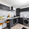 Designer open plan kitchen, fully kitted out with all the necessary appliances that consists of a fridge freezer, washer dryer, kettle, toaster and microwave.