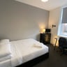 The generously sized bedroom is both stylish and practical, featuring built-in storage and modern furnishings for a clutter-free lifestyle. Natural light fills the room through another large window, giving the space a fresh and airy feel. The contemporary ensuite is fitted with a sleek walk-in shower, fixtures, a large mirror, and easy-care tiled flooring, providing a spa-like atmosphere for daily routines. A dedicated utility room offers multiple appliances, including washers and dryers, along with modern tiled flooring, making household chores simple and efficient.