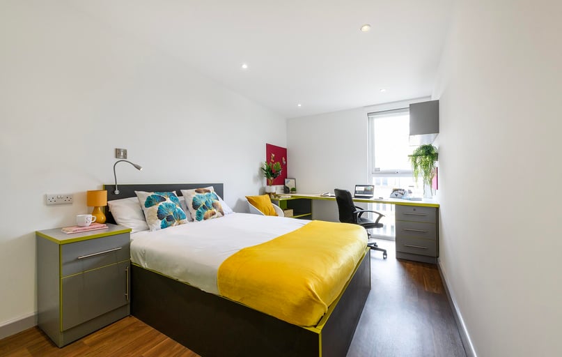 This popular student accommodation offers a choice of studios and en-suite rooms. Studios are self-contained with a bedroom, en-suite, and kitchenette, ideal for those who like more space to themselves. The en-suite rooms are in cluster flats, which you can book as a group of friends, where you’ll share the kitchen and living space with flatmates. All rooms are stylishly designed and come furnished with a bed, plenty of storage, and a desk.