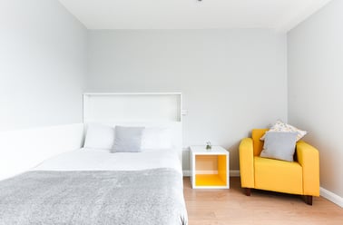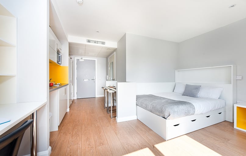 There are a choice of different sizes of studios to choose from at Merchant Studios. All of the well-equipped rooms come with a private kitchen, bathroom and study desk. The light and airy studios come fully furnished with a double bed and plenty of storage.