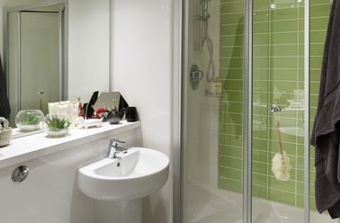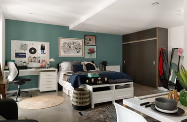 Our spacious, premium studios (21-32 sqm) are suitable for single or dual occupancy and feature a double bed, two wardrobes, two desks, ensuite shower room and kitchen area including a fridge, combi oven and hob.
