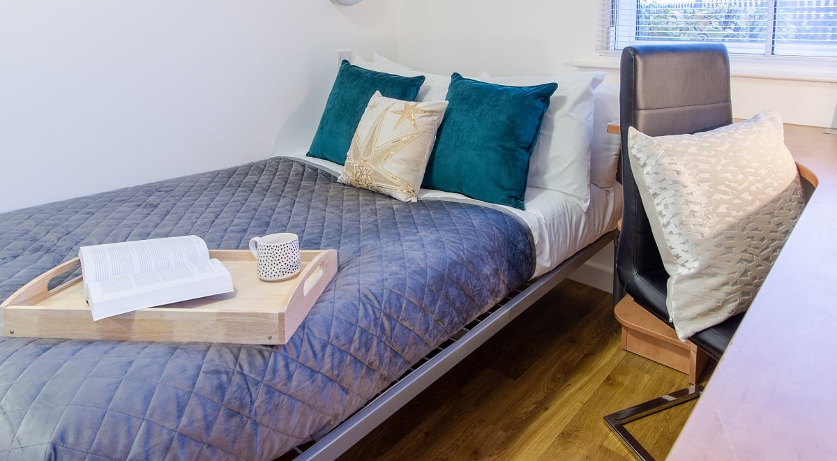 Our student accommodation in Exeter offers students the choice of stunning studios or shared flats. There are TVs in all the shared areas as well as 125Mbps WiFi* throughout the building. Whether you prefer the privacy of a studio or sharing a flat with others your room will come with a large, comfortable bed, a study area, plenty of storage, and all en-suite bathrooms have been finished to an exceptional standard. Studios also come with their own modern, well-equipped kitchenette.