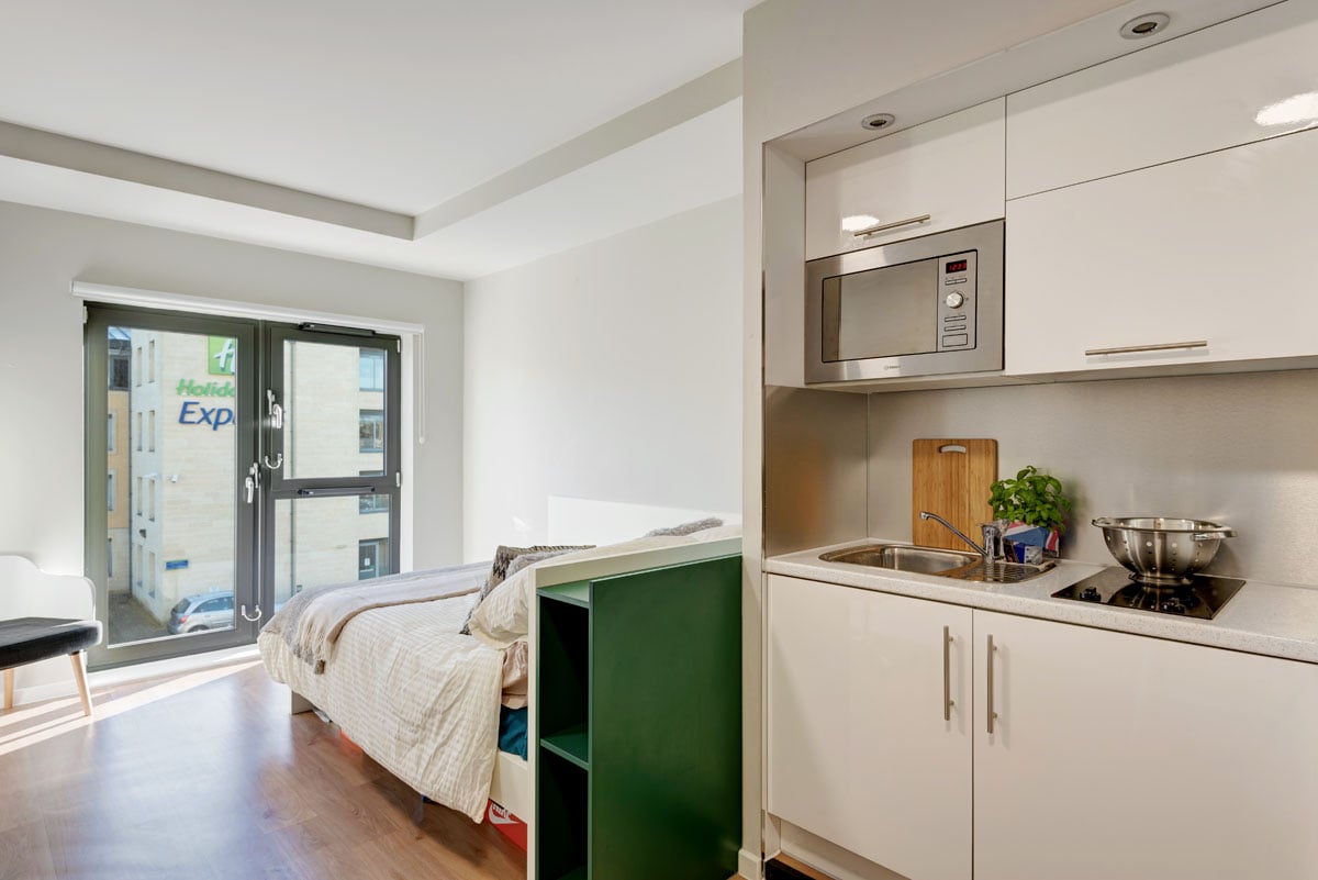 Each room offers a double bed, storage space, spacious work area, en-suite shower room, and your own kitchenette with dining area. There are also fab social spaces including a communal kitchen, quiet study room and tv/lounge area, leading onto an outdoor terrace area with outdoor games.