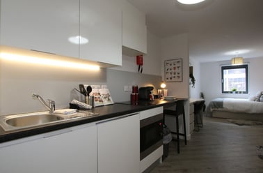 If you’re looking for luxury student accommodation in Cardiff, then there’s only one place you want to be looking at and that’s The Fitzalan. Located right in the heart of the city, you’re just a short walk away from fantastic amenities such as the local train station and Capitol shopping centre. Don’t worry about forgetting any essentials, ‘cos living here during uni will mean you can quickly pop out and be back within 10 minutes - crazy! Designed with students in mind, you’ll be living a sumptuous university life with a stay at The Fitzalan, so expect super-modern facilities and comfortable social spaces! If you prefer your own privacy, then choose one of our stylish studios, or if you fancy living with one of your pals, our two-bedroom apartments are perfect for you! Both offer a ¾ size bed, en-suite bathroom and a fully-kitted kitchen with a combi microwave, hob and breakfast bar and stools. Need to complete a uni deadline? Not to worry, our Cardiff student accommodation provides up to 100Mbps free Wi-Fi to help you out during the busiest of periods. There are even separate study spaces available if you fancy changing up your bedroom desk scenery every once in a while. We know things can get a little stressful, so we’ve installed an on-site gym for you to unwind after a busy day! Decked out with top of the range equipment, there’s no need to purchase a gym membership elsewhere when you can access it from the comfort of your own home. For those who prefer unwinding with friends, we have many areas in The Fitzalan which are best suited for bigger groups. Why not invite your besties over and book out the boujee cinema room? Or, maybe you and your pals are a competitive bunch, if so, you have to get involved in our pool and table tennis tournaments, which take place in the on-site games room! Even spaces such as the common room and communal kitchen are fantastic for socialising and meeting others who live here! Rents are all-inclusive so no need to worry about those unexpected bills! There is even a 24-hour reception, on-site maintenance team and secure fob entry access throughout the building to help you feel extra secure and safe. If this sounds up your street, get in touch with one of our friendly advisors and we’ll be able to help you through the process! Key Features • Cinema Lounge • Gym • Courtyard • Up To 100Mbps* Internet • CCTV • Onsite Maintenance • Communal Lounge • Music Room • Private Dining Room • Bike Storage • Central Location • All Utility Bills Included • Library • Pool Table • Communal Kitchen • Table Tennis / Ping Pong • Table Football / Foosball • Contents Insurance Included • Laundry Room • Dartboard • Gaming Room • Study Space
