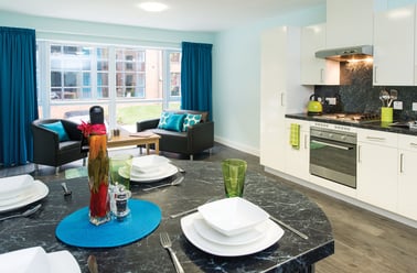Rooms are arranged in flats with 3 to 7 people sharing a large kitchen/social space with sofas and soft seating. All kitchens also contain a cooker, fridge freezer, microwave, kettle, toaster, sink, drainer, cupboards, work tops and table and chairs or breakfast bar with seating. Each bedroom has a small double bed with underbed storage, a modern ensuite, bookshelves, a wardrobe, a desk and chair and hi-speed internet. There is also a large common room with TV and a pool table.